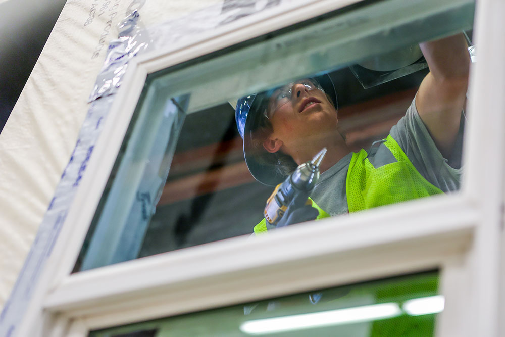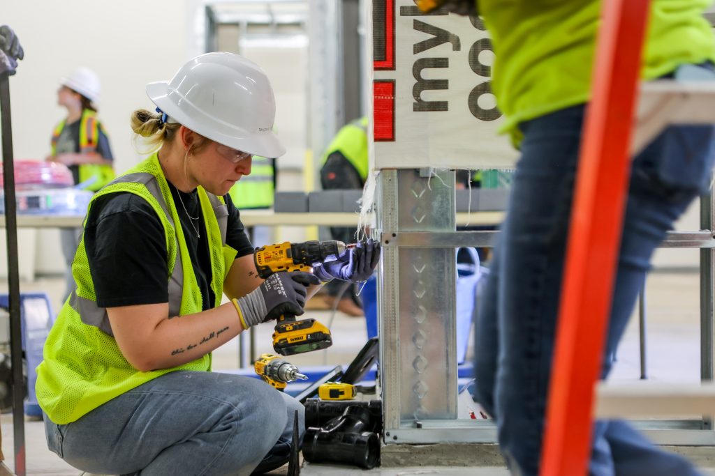 All the teams this year are building one corner of a bathroom module. That includes putting up two walls, pouring concrete, installing anchor bolts that connect the metal framing to the foundation, installing drywall, weatherproofing and installing electrical and plumbing. When their module is done, they have to connect it to another team’s module. It’s a significant amount of work, and the builders are shouldering that heavy labor.