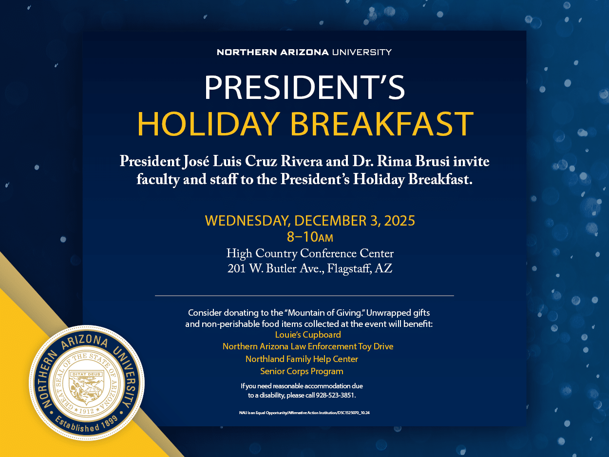NAU faculty and staff are invited to this year’s President’s Holiday Breakfast, hosted by President José Luis Cruz Rivera and his wife, Rima Brusi. The event will take place from 8-10 a.m. on Wednesday, Dec. 3 at High Country Conference Center to celebrate the festive season.